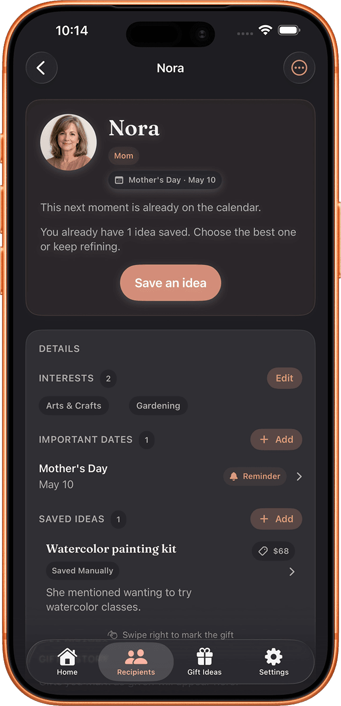 The offhand comment, the screenshot, the link a friend sent. Capture it while it is still fresh and attach it to a recipient, so later you are picking between three real ideas instead of scrolling under pressure.